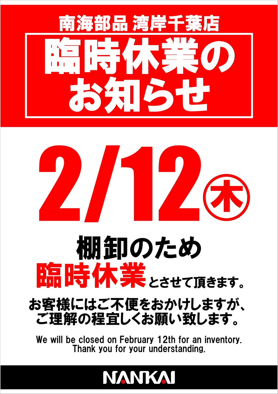 棚卸業務の為、【2月12日(木)】は終日臨時休業とさせて頂きます。