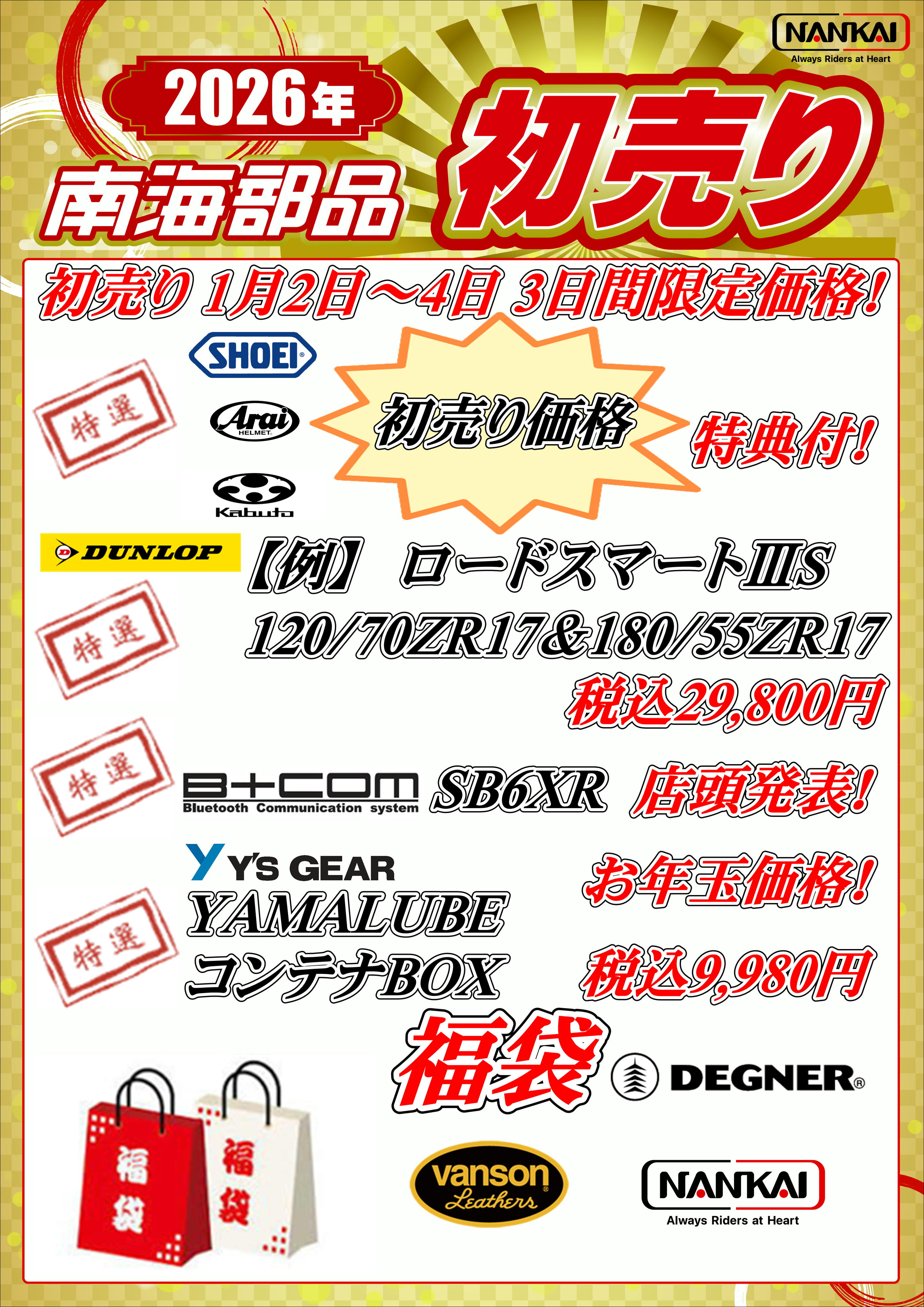 南海部品熊谷店では、新年の感謝を込めて 【1月2日~1月4日】に初売りセールを開催いたします!