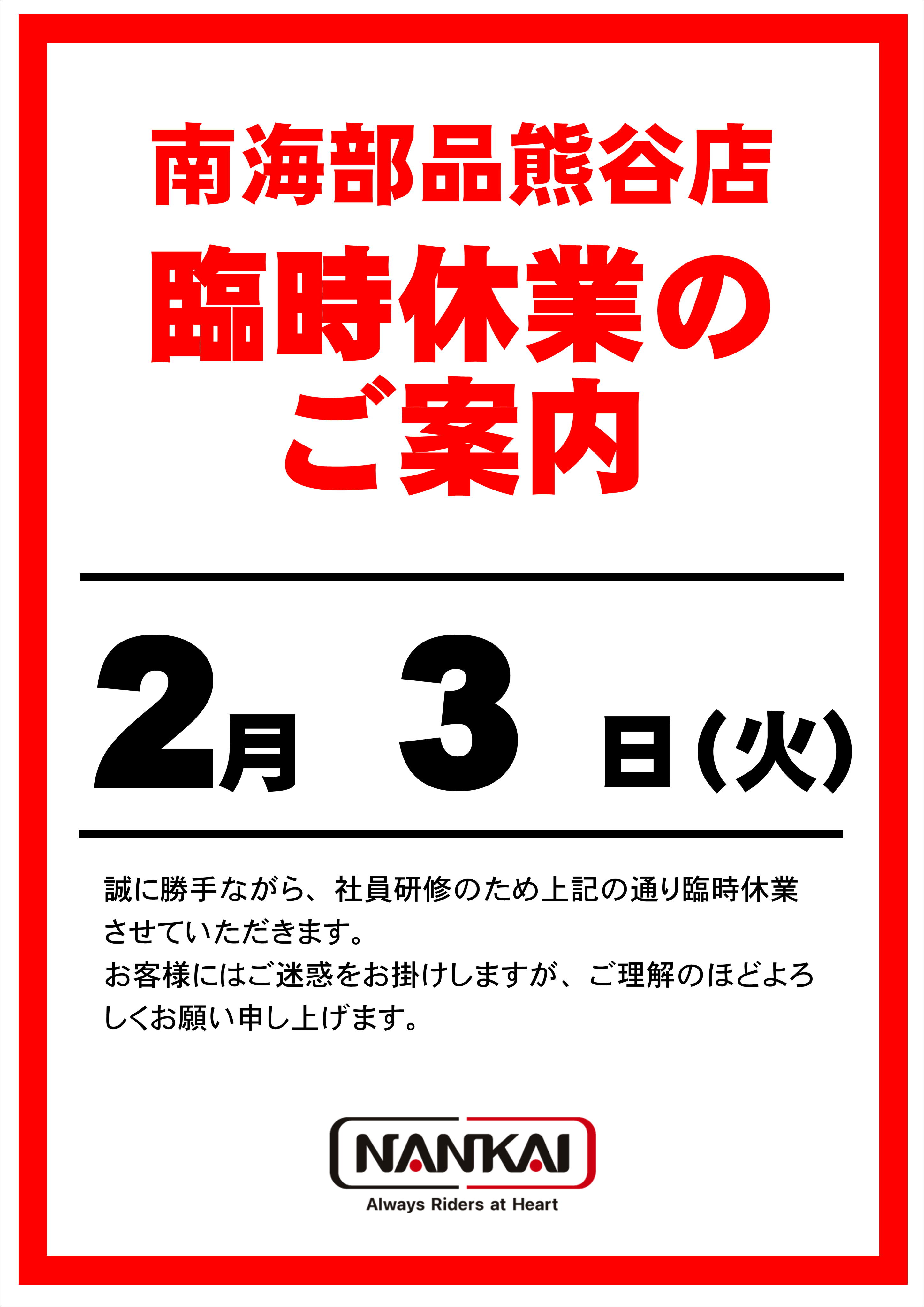 2月3日(火)は社員研修の為、臨時休業させていただきます。