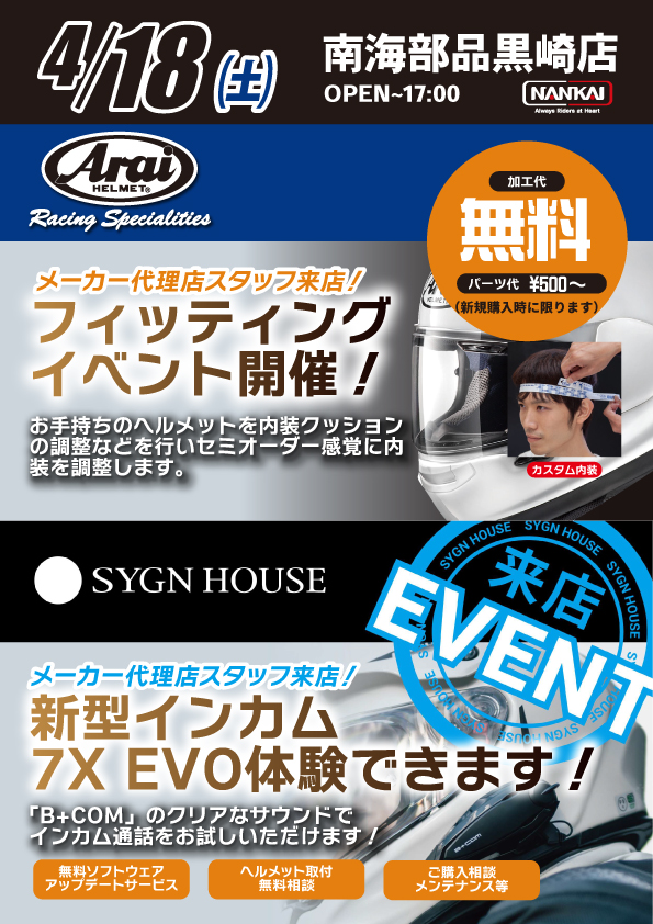 4月18日(土)【Arai】フィッティング&【SYGN HOUSE】新型インカム7X EVO体験イベント開催