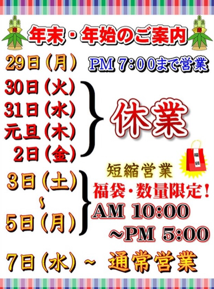 今年も残りわずかとなって来ました 年末年始の営業日と営業時間のご案内です