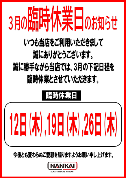 3月の臨時休業日のご案内